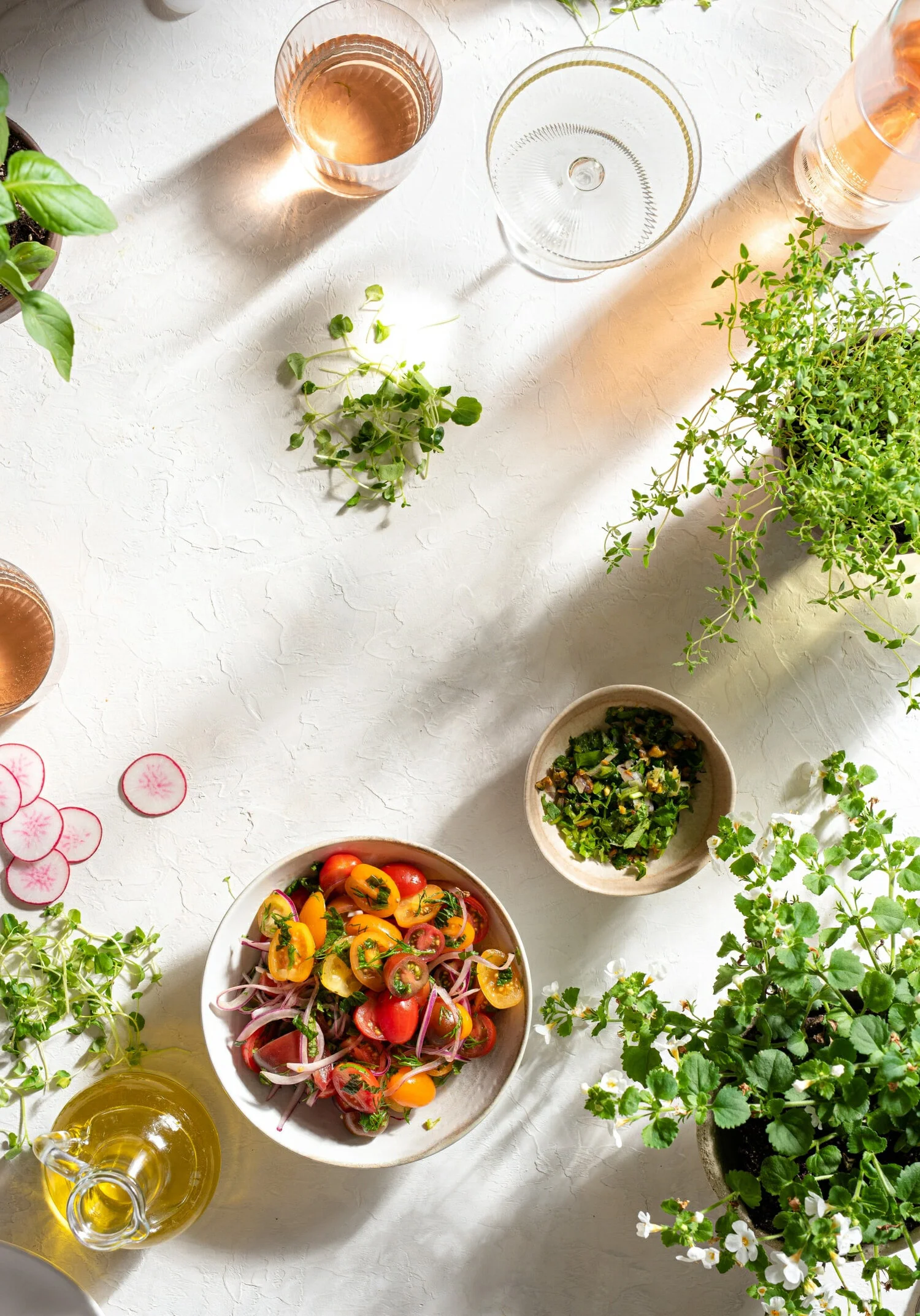 Preparation:Combine cherry tomatoes, red onion, and herbs (reserving some for garnish) in a large bowl. Dress with olive oil, lemon zest and juice, salt, and pepper. Toss gently to coat.